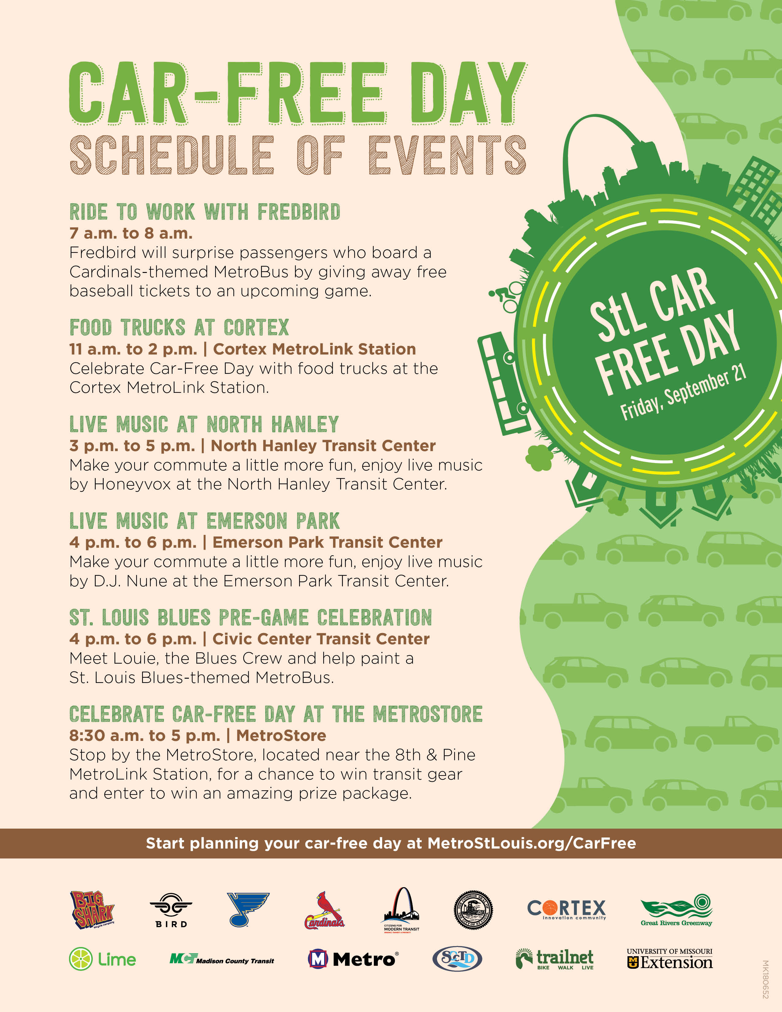 STL Car-Free Day begins during the early morning commute on Friday with a visit from Fredbird, who will surprise passengers on one of the area’s MetroBus routes with free tickets to an upcoming Cardinals game, followed by a lunch-time Transportation Pop-Up in the Cortex Innovation Community with food trucks and information from regional transportation partners. Metro Transit riders heading home or traveling to Blues and Cardinals games in downtown St. Louis that evening will be able to enjoy live music at the North Hanley and Emerson Park Transit Centers, and the St. Louis Blues will host a car-free, pre-game celebration at the Civic Center Transit Center with Blues mascot Louie, the Blues Crew and a Metro Arts in Transit bus painting.